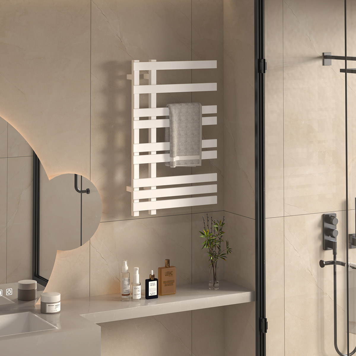 9桿電熱毛巾架 9 bar heated towel rail 材質Material:Mild Steel 低碳鋼 功率Power:220V/220W 表面Surface:White Painted 白色噴塑 尺寸Size:500*120*800mm 包裝Ctn size:540*100*900mm